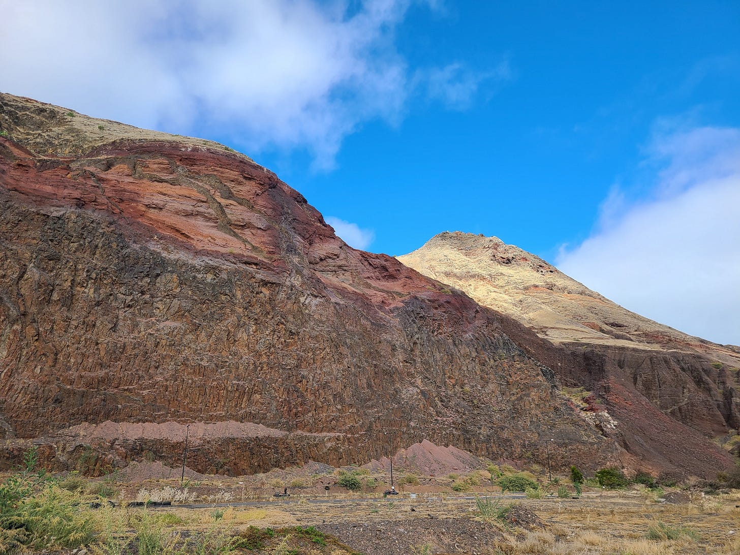 This time, we plan to stay even longer, maybe sailing to the amazing Azores in the spring after the boat repairs are done. Our days are quiet and slow. Dyola is on the hard at the foot of those dry hills we first saw from out at sea. These hills don’t roll, they curl protectively around our little harbor and town, sheltering us from the prevailing north wind. For a person with hurricane trauma, such as myself, wind protection is a sweet gift. I have grown to appreciate the way the light plays on the steep rocky slopes, a little red there, a patch of yellow and long lines of what looks like stone walls, but clearly aren’t. One line of dark stones is raised in points like teeth. I try to imagine the volcanic eruption that laid these lines of cracked black rocks in the reddish-brown dirt. Sunrise comes late as the hills block the sun for an hour after official sunrise. Past the hills, over the sea, the morning sky is pink and lavender. During the day, cloud shadows creep along, dimming some spots while others remain bright.