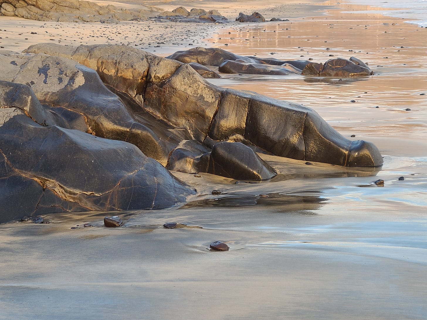 On our second visit to Porto Santo, we stayed almost our full allowance of ninety days. On the beach, the sand shifted over the course of weeks to reveal smooth black volcanic stones, some of which formed the shape of a hippopotamus. After we named Hippo Rock, it became like a familiar friend on our evening beach strolls. We carried some of the small black rocks back to the boat, but when they dried they turned an unhappy gray so we returned them to the surf where they could shine so beautifully in the cool water. Most often, we had the beach to ourselves. The water was perfectly clear and with the sun out it was a lovely aquamarine, going darker with the depth farther out. After the Caribbean, the water felt very cold to me, but also refreshing after a long walk on the soft sand in the bright sunshine.